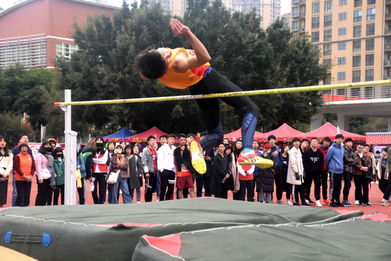12月13日上午,在操场上举行的学生男子甲组跳高比赛中,来自海洋与食品学院16级海洋技术的王煜超同学再次夺下冠军。
