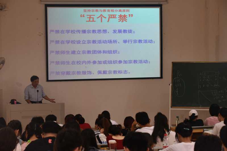 蔡英卿强调,在校园内要做到“五个禁止”,即:严禁在学校传播宗教思想、发展信徒;严禁在学校设立宗教活动场所、举行宗教活动;严禁师生建立宗教团体和组织;严禁师生在校内外参加或组织参加宗教活动;严禁穿戴宗教服饰、佩戴宗教标志。