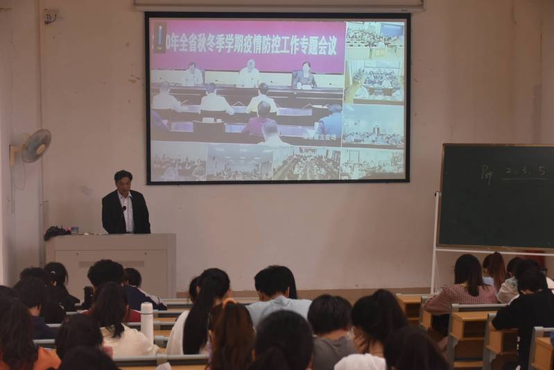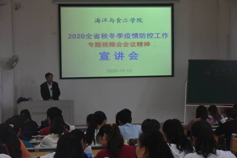 11月13日,海洋与食品学院全体学生骨干在理工楼320教室学习2020全省秋冬季疫情防控工作专题视频会会议精神。海洋与食品学院党委书记蔡英卿主持学习活动。