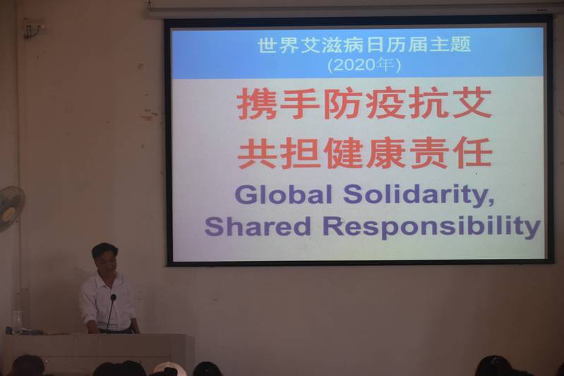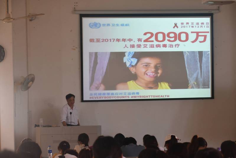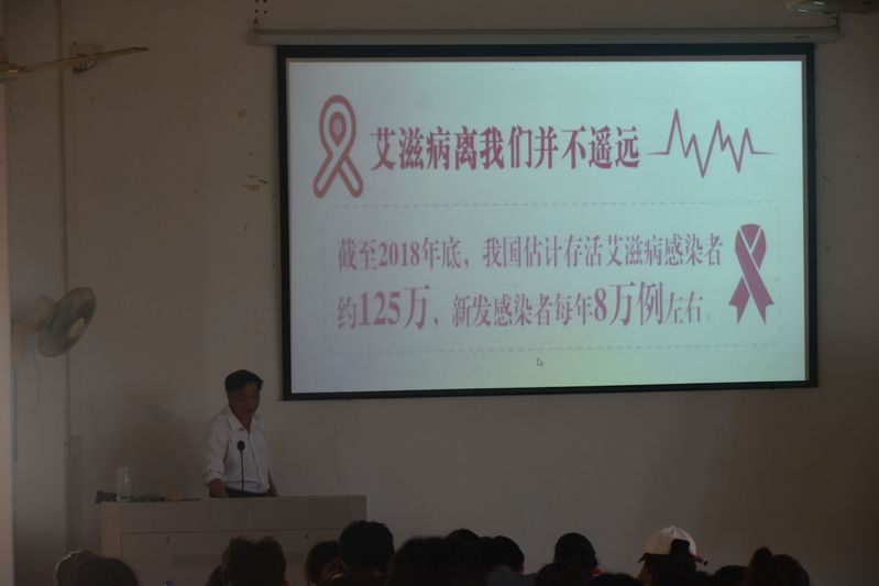 艾滋病全称是“获得性免疫缺陷综合征”,缩写为AIDS,它是由艾滋病病毒即人类免疫缺陷病毒(HIV)引起的一种病死率极高的恶性传染病。随后,蔡英卿向同学们介绍艾滋病的病发阶段、疾病症状、治疗和控制方法、传播途径、检测方法、能否治愈等知识。蔡英卿指出,2020年12月1日是在第33个世界艾滋病日,要“携手防疫抗艾,共担健康责任”,要学习了解关于防艾滋的知识,增强个人防艾的使命感和责任感,提升防艾、抗艾的能力。