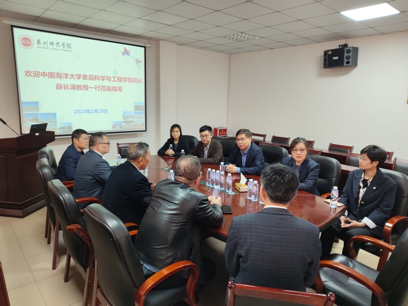 日前,中国海洋大学食品科学与工程学院院长、泰山学者“攀登计划”专家薛长湖教授一行五人莅临我院考察并座谈交流。学院院长袁建军教授、党委书记蔡志荣、副院长郑宗平教授,学院教师代表林祥志研究员等参加了座谈,座谈会由袁建军主持。