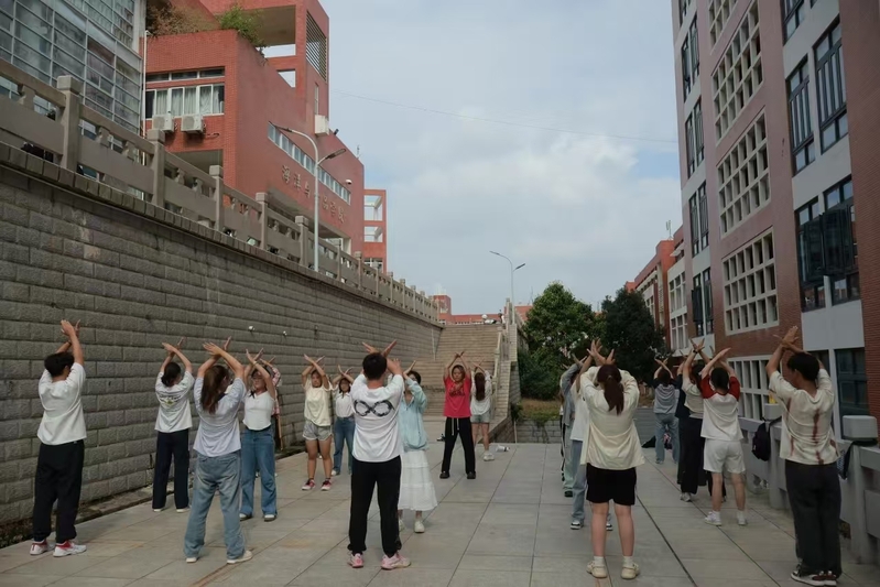 为迎接即将到来的第42届校运动会,排舞成员每天中午、晚上在宝龙楼或理工楼前集合,开展紧张而有序的训练。