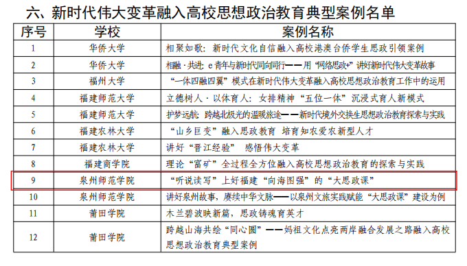 近日,福建省高校思想政治工作质量提升综合改革与精品建设项目遴选结果公布。我院《“听说读写”上好福建“向海图强”的“大思政课”》获批新时代伟大变革融入高校思想政治教育典型案例。