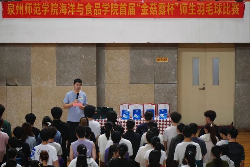 4月12日上午,我院首届“金菇露”杯羽毛球比赛在明德体育馆盛大开幕,泉州金菇露生物科技有限公司总工程师吴耿煜,学院党委书记蔡志荣,党委副书记、副院长梁鹏,党委副书记刘礼元,团委副书记、学工办副主任王哲芳以及全体辅导员出席开幕式。我院师生运动员共100余人参加比赛,比赛共分为男双、女双和混双三个项目。