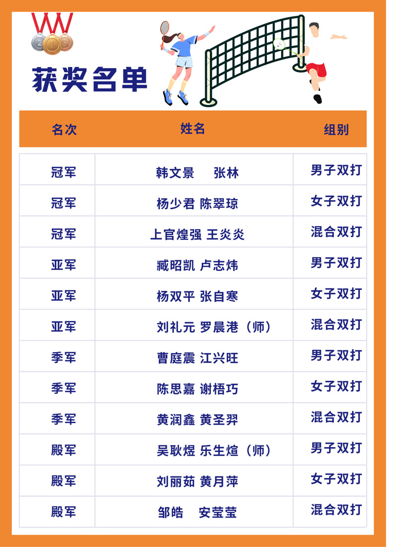 经过激烈角逐,选手们展现了各自的技术水平、团队精神和比赛风格,本次比赛结果已经产生,本次比赛设有男子双打,女子双打和混合双打三个项目,三个项目各自决出冠军一组,亚军一组,季军一组,殿军一组,获奖名单如下: