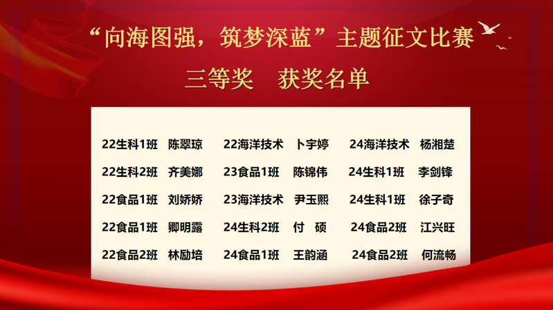活动精心选取《向海》《山海经》《马江半小时》《海族列传》等海洋文化书籍作为共读书目,引导同学们以专业视角深入挖掘海洋文化内涵,探寻海洋发展路径。同学们积极响应,踊跃参与,从多视角剖析海洋文化。有的同学凭借海洋生物学知识,探讨生物多样性保护与开发;有的同学结合海洋科技、海洋贸易等内容,阐述福建海洋经济发展脉络。作品既展现了学生扎实的专业知识,又饱含对海洋事业的热爱和家国情怀,彰显出他们对海洋文化的深刻理解,以及建设海洋强国的责任担当。为表彰优秀、树立榜样,学院隆重举办了颁奖仪式。