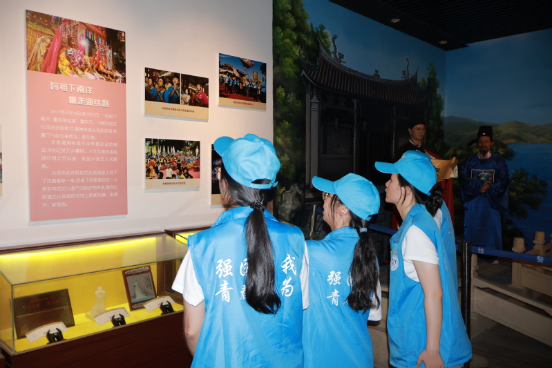 在莆田,实践队走进莆田市博物馆与妈祖源流博物馆,深入研习妈祖文化。一幅幅生动的历史画面,让队员们清晰触摸到妈祖信仰从地方保护神到全球华人共同信仰的演进脉络。作为因海而生的信仰,妈祖以“立德、行善、大爱”为精神内核,既承载着渔民对平安的祈愿,更折射出福建海洋文化“以和为贵”“守望相助”的价值取向。这种崇尚和平、追求共生的理念,让队员们真切体会到与“和合”精神的一脉相承。如今,妈祖文化早已超越地域与族群,成为沟通五洲、联结四海的“情感纽带”:台湾同胞的寻根祭拜、东南亚侨胞的跨洋朝圣等,无不印证着“四海一家”的文化认同。湄洲祖庙前,队员们悉心倾听着老人那句“在这里,大家都是一家人”,于朴实话语中深切领会到信仰的本质:它不仅是祈福的仪式,更是中华民族共同体意识的凝聚,为构建人类命运共同体注入“美美与共”的中国智慧。