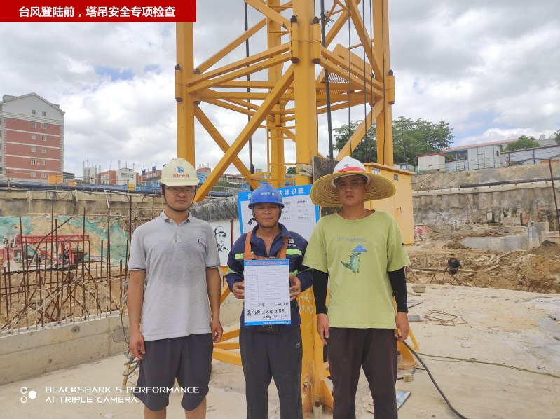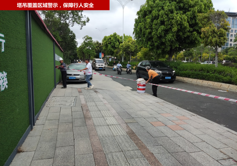 工科大楼项目设有塔吊起重机械,为防止超强台风对塔吊的破坏,造成人身、财产损失,基建处组织项目部针对塔吊进行专项检查加固,并对于塔吊覆盖临街区域,采取警示的方式避免对行人造成损伤。