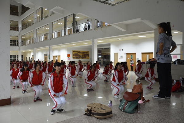 本报讯(记者:何晓敏)11月1日,在负责人的带领下,代表我院参加广播体操比赛的同学们在荣茂楼进行训练。先主要采用分解动作练习,在跟上节拍把每一个动作串联起来,最后合上音乐练习整套广播体操。同学们的动作整齐划一,刚劲有力。