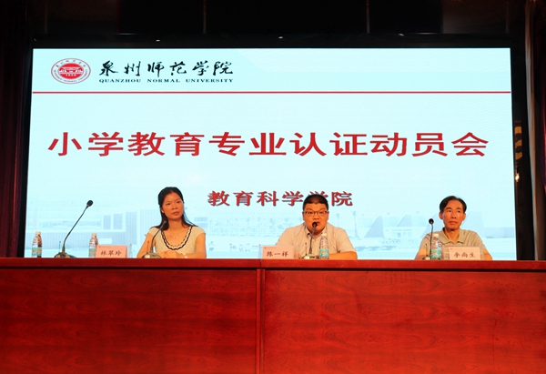 本报讯 为迎接师范类专业认证评估,9月6号下午,教育科学学院在特教大楼第一学术报告厅召开了“迎接小学教育专业认证评估动员大会”。教育科学学院党委书记陈一祥、小学教育专业主任李尚生、学工办负责人林翠玲出席了会议,小学教育专业全体学生参加了本次会议,会议由林翠玲主持。