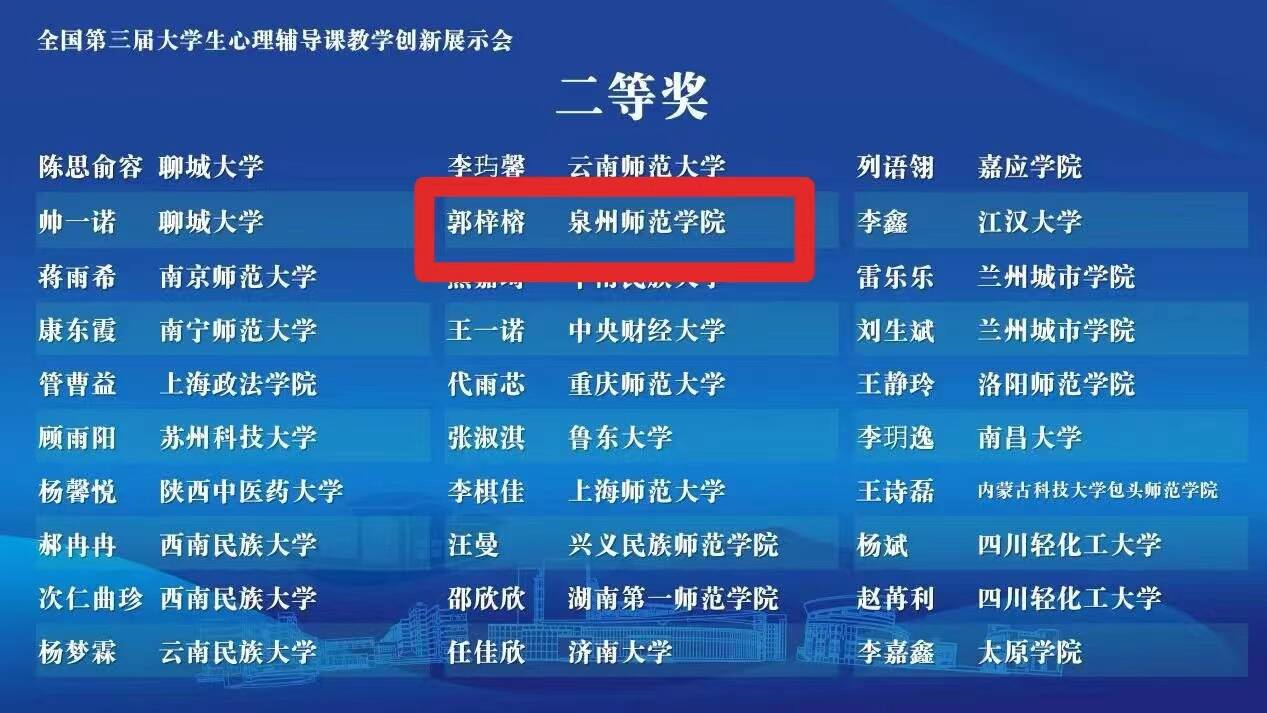 2024年4月25—26日,全国第三届大学生心理辅导课教学创新展示会在浙江桐乡举办。教育科学学院应用心理学专业学生郭梓榕获得此次大赛的全国二等奖。