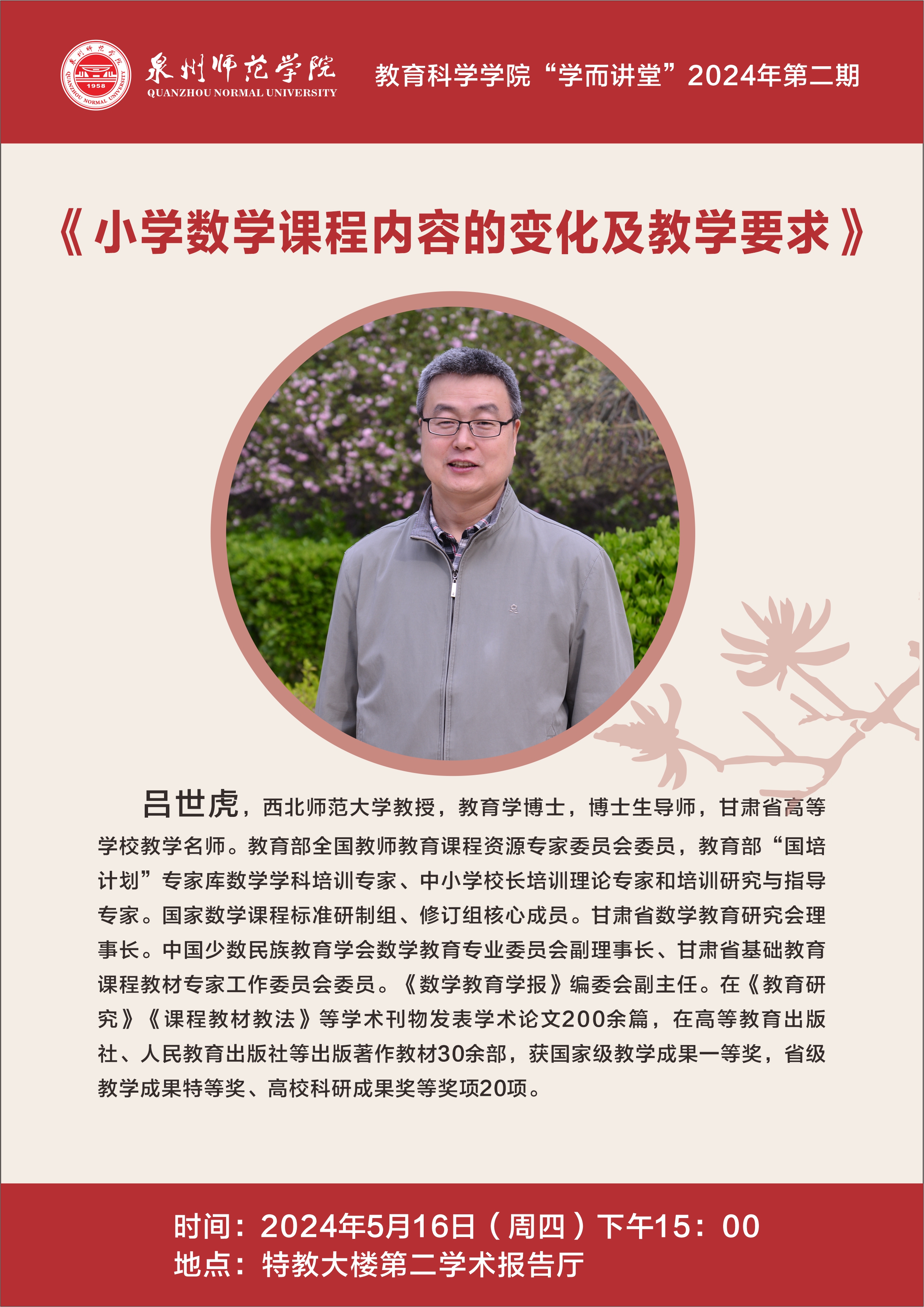 讲座预告:吕世虎 《小学数学课程内容的变化及教学要求 》