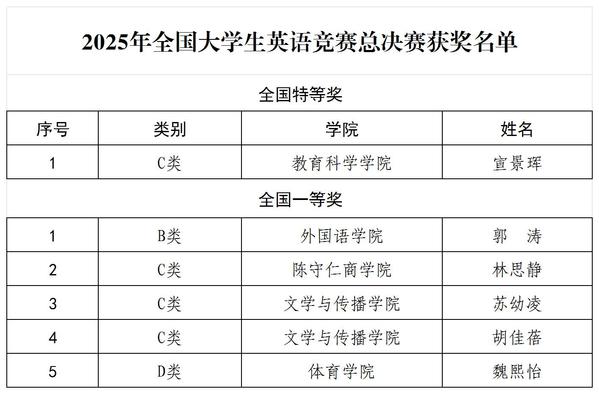 近日,2025年全国大学生英语竞赛(NECCS)福建省赛区总决赛在福州圆满落幕。本届赛事吸引了全国近千所高校的30余万名学子参与,经过初赛、复赛的激烈角逐,教育科学学院2022级数字媒体技术专业宣景珲同学凭借卓越的英语语言能力、创新的跨学科思维和沉稳的临场表现,从全国C类(非英语专业本科组)选手中脱颖而出,一举斩获全国特等奖,为学院争得殊荣,展现了教育科学学院学子锐意进取的精神风貌并获得“2025年全国大学生英语竞赛全国总决赛”入场券。