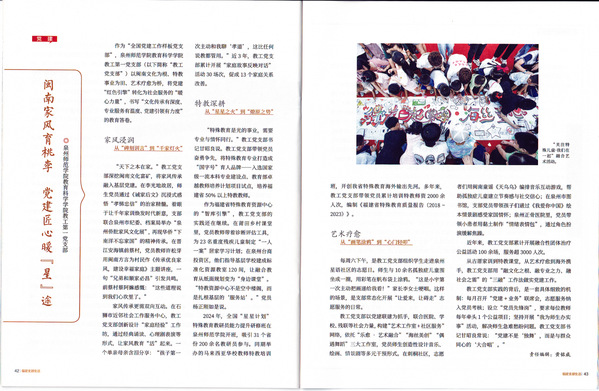 近日,福建省党建综合性刊物《福建支部生活》2025年第6期刊发了教育科学学院教工第一党支部《闽南家风育桃李 党建匠心暖“星”途》的典型经验做法。文章聚焦该支部以融闽南文化之根、融特殊教育之力、融社会服务之需的“三融”工作法为核心,通过闽南家风传承、特殊教育深耕、艺术疗愈服务等创新举措,构建“文化传承有深度、专业服务有温度、党建引领有力度”的育人格局。