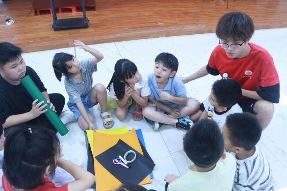 协作启智、创意育人。为培养小朋友的团队意识,实践队成员策划了一场团体心理辅导活动:通过趣味游戏巧妙分组,有的孩子负责指挥,有的孩子主动搭手帮忙,在协作中亲身体会“单丝不成线,独木不成林”的道理。随后,孩子们变身手工小达人,用彩纸剪裁出独一无二的创意服饰——红色的热情、蓝色的冷静,色彩与造型成了心情的“代言人”。孩子们在动手创作中迸发想象力,在作品完成时收获自信,更在互动中悄然播下友谊的种子,让这场活动成为集协作启蒙与创意成长于一体的生动体验。