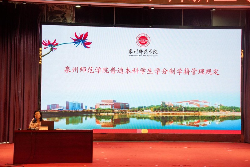 首先,教学科研办主任黄雪燕围绕学制管理、学分管理、成绩考核、违规违纪等方面展开解读,从制度层面引导新生明确学习目标、规划学习计划、树立规则意识,从而让新生对学籍管理相关规定有了更深层次的理解,激发新生学习主动性与成长目标感。