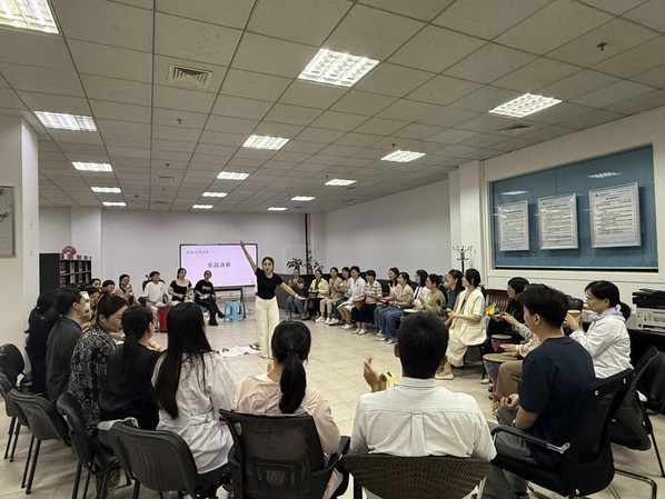 活动伊始,四十位医护人员通过10分钟的音乐冥想调整呼吸、放松身心,初步释放日常积累的紧张情绪。随后,“阿水的故事”作为破冰游戏,以轻松有趣的互动迅速拉近了彼此距离。在接下来的十五分钟乐器敲打环节,参与者们手持鼓、沙锤、木鱼等打击乐器,跟随节奏自由敲打,借助音乐律动释放压抑情绪。最后十分钟的身体律动释放,成员们引导参与者随音乐节拍自由摆动身体,以非言语方式表达内心感受,体验身心同步的轻松与愉悦。