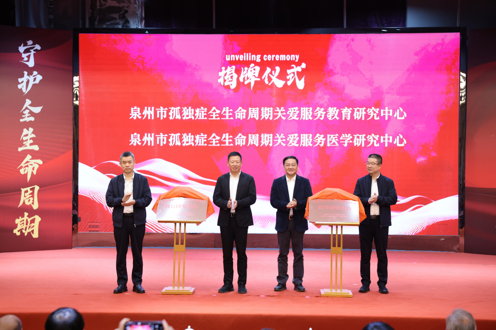 黄辉灿、陈昌萍、李伯群、连景忠共同为“泉州市孤独症全生命周期关爱服务教育研究中心”和“泉州市孤独症全生命周期关爱服务医学研究中心”揭牌。