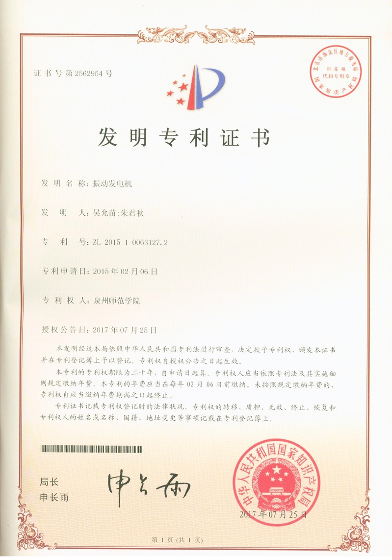 本项目已申请一项发明专利,该专利公开一种振动发电机,其有益效果在于该发明的磁振子能够在任一方向上自由振动,收集任一方向上的振动能,并随之振动并改变外部线圈的磁通量,通过磁生电原理将振动能转化为电能;而且不受摆放方向限制,在移动通信设备如智能手机、平板电脑以及电动汽车等各领域有广泛的应用前景。