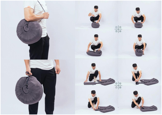 本实用新型公开了一种用于收纳可披挂抱靠用品的环型翻转式收纳袋,所述可披挂抱靠用品的一端设有夹层,所述夹层设有开口,该开口由拉链封口,所述收纳袋首尾相连形成环状,收纳袋的一端与夹层内侧连接,收纳袋的两侧各设有袋口,所述袋口翻转后将可披挂抱靠用品包裹在收纳袋内。本实用新型通过翻转方式包裹住物品,通过袋口的束绳进行收口,并且可以调节收紧状态,也起到紧实压缩被包裹物体的作用,方便可披挂抱靠用品的收纳与携带。