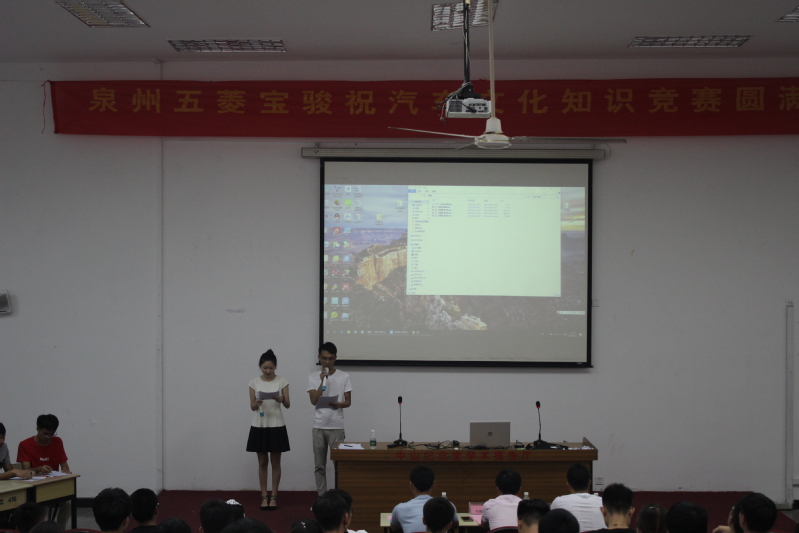 应用科技(航海)学院5月31日讯 (学生记者 李锦婷) 一场智慧的交锋,一次思想的碰撞,2018年5月31日14时30分,我院16级汽车服务工程承办的汽车文化知识竞赛决赛于中山学术报告厅1楼举办。出席本场比赛的评委为邓腾树老师、戴文攀老师、施生明老师。以及相关负责人、观众等到场。本次决赛由赞助方泉州五菱宝骏赞助举办。