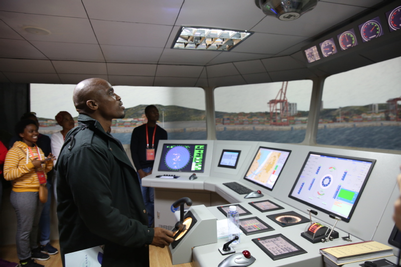 在大型船舶操纵模拟室,航海学院资深船长苏瑞华全程使用英语为学员们讲解了船舶的基础知识,包括船舶的类型、长纵横宽、船舶的结构、船舶可以运输的货物等等,并为各位学员演示船舶在无风无浪、大风大浪和降雪气候条件下的操纵及应对,培训学员们对此感到十分钦佩。