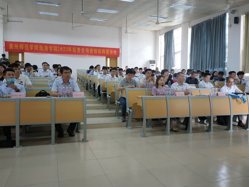 2020年10月8日下午2点,航海学院2020年船务公司进校招聘宣讲会在理工楼320梯形教室召开。参加本次宣讲会的公司包括中泉集团船务公司、中挪诺航船务公司、泉州兴诺信船务有限公司、厦门海隆对外劳务合作有限公司、厦门泛海船务公司、台塑厦门华海佑船务公司、北京华洋海事中心、中远海运广州分公司、中远海运深圳分公司、中远海运上海劳务、中远海运厦门劳务等11家船务公司。航海学院院长俞文胜、院党委主持工作副书记洪少春、学工办全体辅导员、2017级全体航海类专业毕业生参加了本次宣讲会。