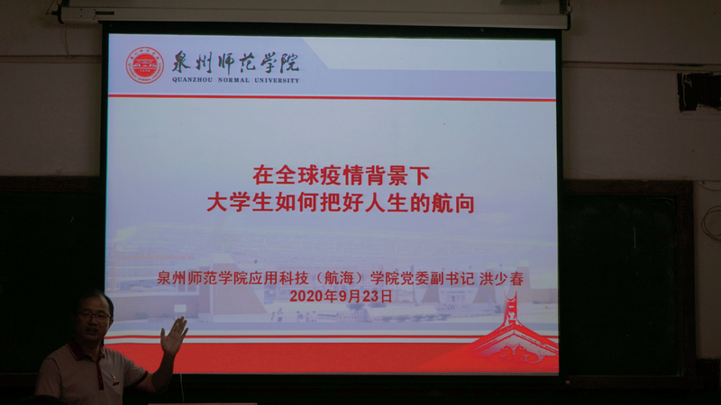 2020年9月23日晚,应用科技(航海)学院党委副书记洪少春在南安校区科学楼302教室为2020级市场营销1班上了一堂以“在全球疫情背景下大学生如何把好人生的航向”为主题的思政课。