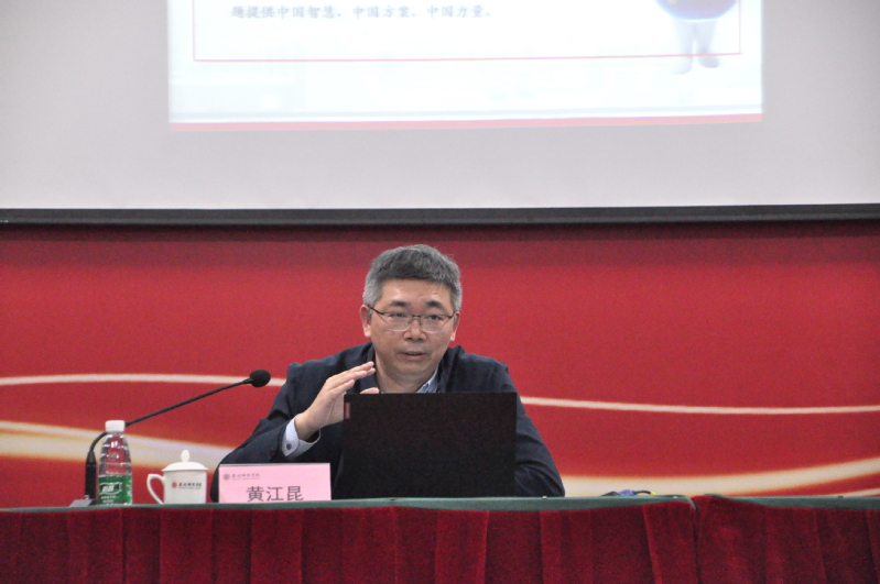 黄江昆以新冠疫情防控为切入点,详细介绍了中国抗击疫情艰辛历程的五个阶段,并讲述了我国“命运共同体”的思想是如何从一次次的理论实践中构建成的。在课上,黄江昆指出当代青年肩负的三个使命要求:一是树立大局意识,开拓国际视野。就是在民族认同的基础上向国际视野拓展;二是主动担当作为,负起青春责任。黄江昆分享了两个我校同学的“战疫故事”,并鼓励同学们要有主动担当作为的使命感;三是牢记初心使命,共筑青春共同体。黄江昆嘱咐同学们要牢记习近平总书记对广大青年提出的五点希望,做一个有理想、有本领、能创新、敢奋斗、具有高尚品格的新时代青年。