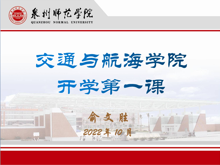 院长俞文胜教授为新生们讲授了开学第一课,介绍了泉州的人文历史、经济社会发展情况,以及交通与航海学院的发展历程、各专业特色、发展前景等。课上,他还以2022年毕业生就业分析为背景,循循善诱启发新生们如何做好大学四年的学习与生活规划,希望他们能最大限度地利用大学生活,将知识与执行相结合,全面提升综合素质,在实践中增强自身的力量与价值。