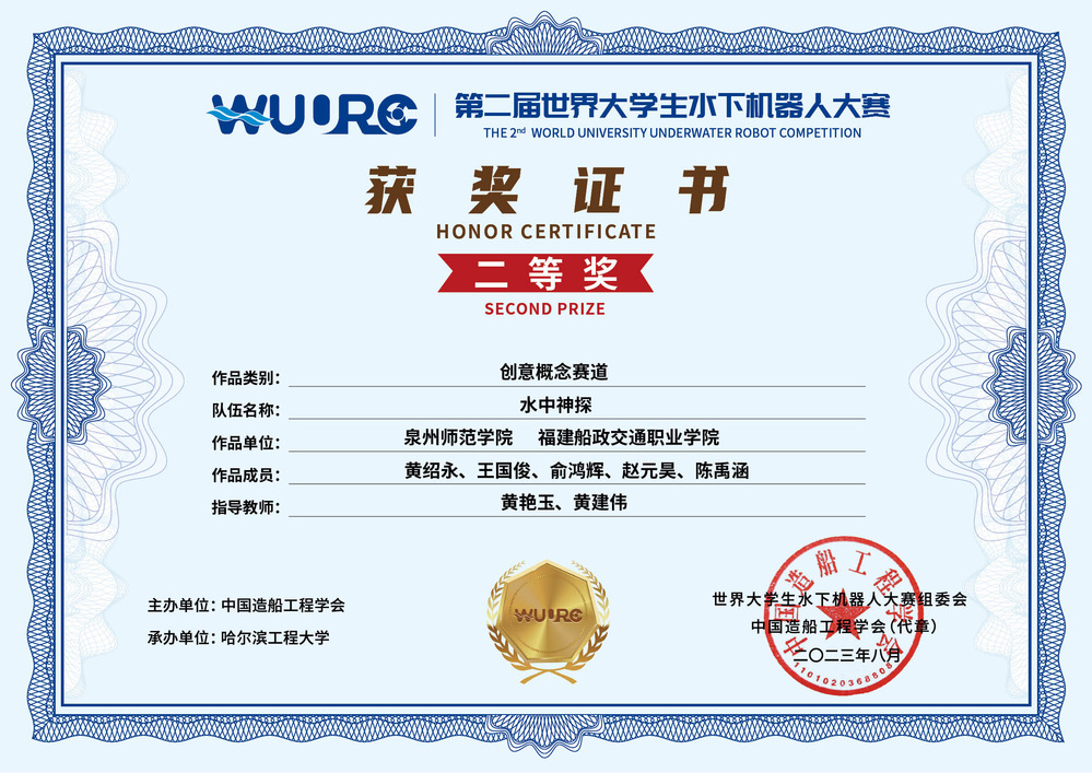 8月11日至13日,第二届世界大学生水下机器人大赛在哈尔滨工程大学举行,由我院教师黄艳玉与福建船政交通职业学院教师黄建伟指导的学生参赛队(队长:交航学院黄绍永,队员:交航学院王国俊、俞鸿辉,赵元昊,福建船政交通职业学院陈禹涵)荣获创意概念赛道二等奖。这是我校首次进入此项大赛并取得优异成绩。