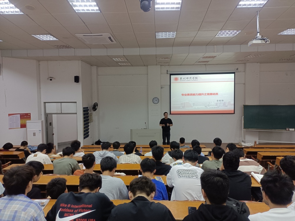 会上,邓腾树老师从学科竞赛的重要性与价值、历届参赛情况及同学获奖情况、学科竞赛赛事内容介绍、学院竞赛设施资源等四个方面向同学们介绍了参加竞赛的益处及必要性。他指出,参加竞赛不仅能激发同学们的专业学习热情、提高专业学习能力和实践应用能力,而且在以后考教面试、考公面试、就业面试和考研复试等诸多方面都有很大益处。他对同学们寄予了殷切期望,希望各位同学在学好自身专业课程的基础上勇于参赛,以赛促学,以赛代练,不断为自己专业知识充电,学有所成。