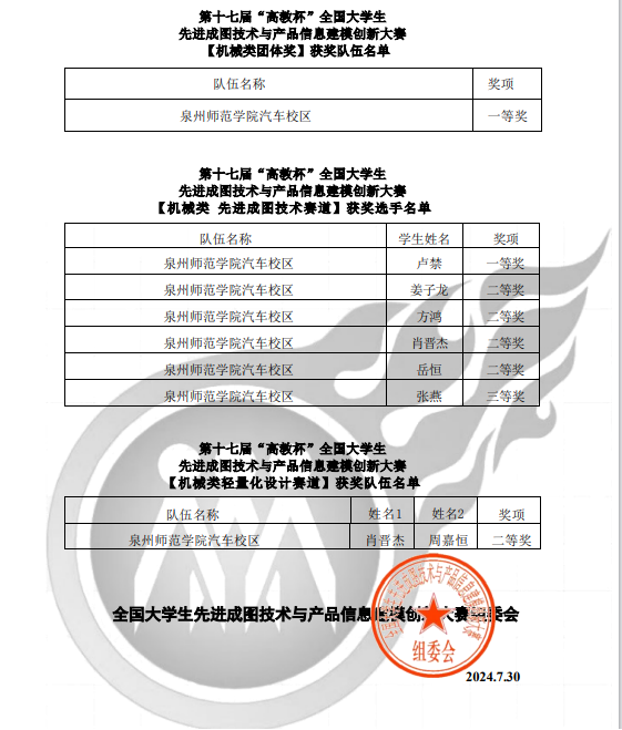 7月29日,第十七届“高教杯”全国大学生先进成图技术与产品信息建模创新大赛总决赛在贵州大学落下帷幕。我院汽服学子在此次比赛中表现出色,获得全国机械类团体奖一等奖1项(排名71/895),全国机械类成图技术赛道个人奖一等奖1项(排名148/16294)、二等奖4项、三等奖1项,轻量化设计赛道二等奖1项,在获奖数量与质量上均创历史新高,五位指导老师均获得优秀指导老师一等奖。