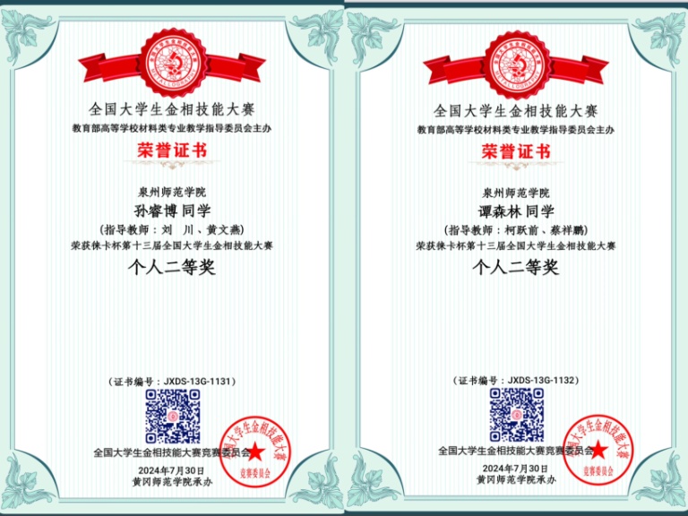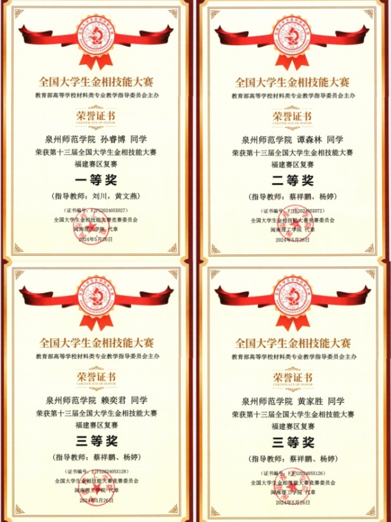 在此前进行的第十三届全国大学生金相技能大赛福建赛区复赛(省赛)中,轮机专业孙睿博(指导老师:刘川,黄文燕)获一等奖,汽车服务工程专业谭森林(指导老师:蔡祥鹏,杨婷)获二等奖,汽服黄家胜(指导老师:蔡祥鹏,杨婷)、汽车服务工程专业赖奕君(指导老师:蔡祥鹏,杨婷)获三等奖;在省赛的金相大会赛道,汽车服务工程专业赖奕君(指导老师:杨婷,蔡祥鹏)、汽车服务工程专业黄家胜(指导老师:杨婷,蔡祥鹏)获二等奖,轮机工程专业吴慧玲(指导老师:刘川,黄文燕)获三等奖,并取得团体三等奖的好成绩。蔡祥鹏、杨婷两位老师也分获优秀指导教师奖。