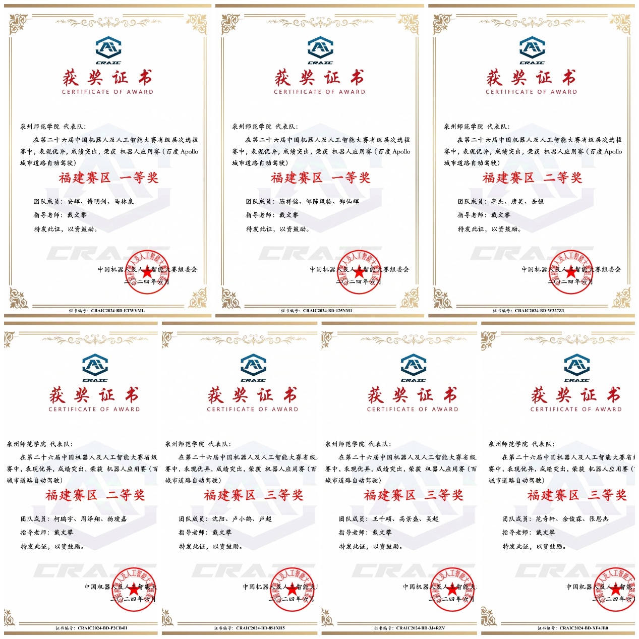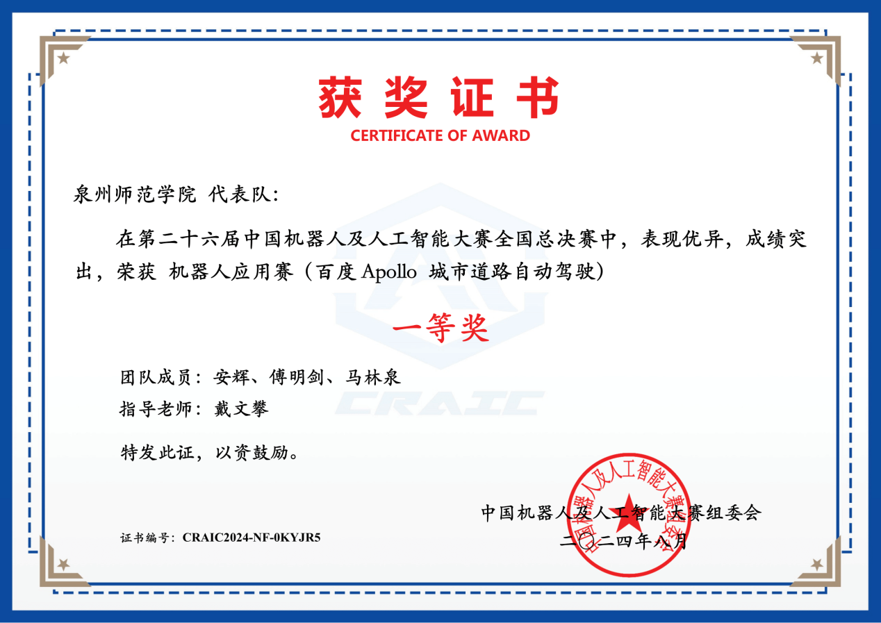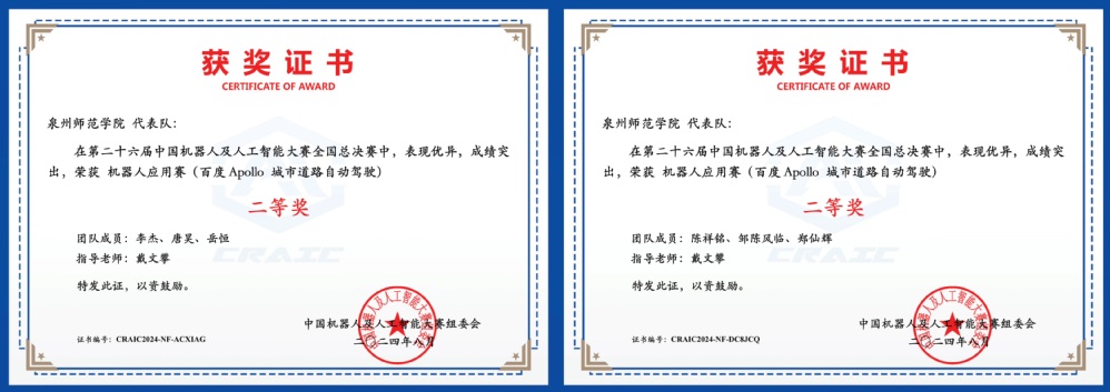 8月24日,第二十六届中国机器人及人工智能大赛全国总决赛在江苏宜兴举行。我院选派的3支代表队全数获奖,汽车服务工程专业安辉、傅明剑、马林泉(指导老师:戴文攀)获得“百度Apollo城市道路自动驾驶”赛道全国一等奖,汽车服务工程专业李杰、唐昊、岳恒(指导老师:戴文攀),汽车服务工程专业陈祥铭、邹陈风临、郑灿辉(指导老师:戴文攀)分获全国二等奖,是福建省所有参赛高校中取得的最好成绩。