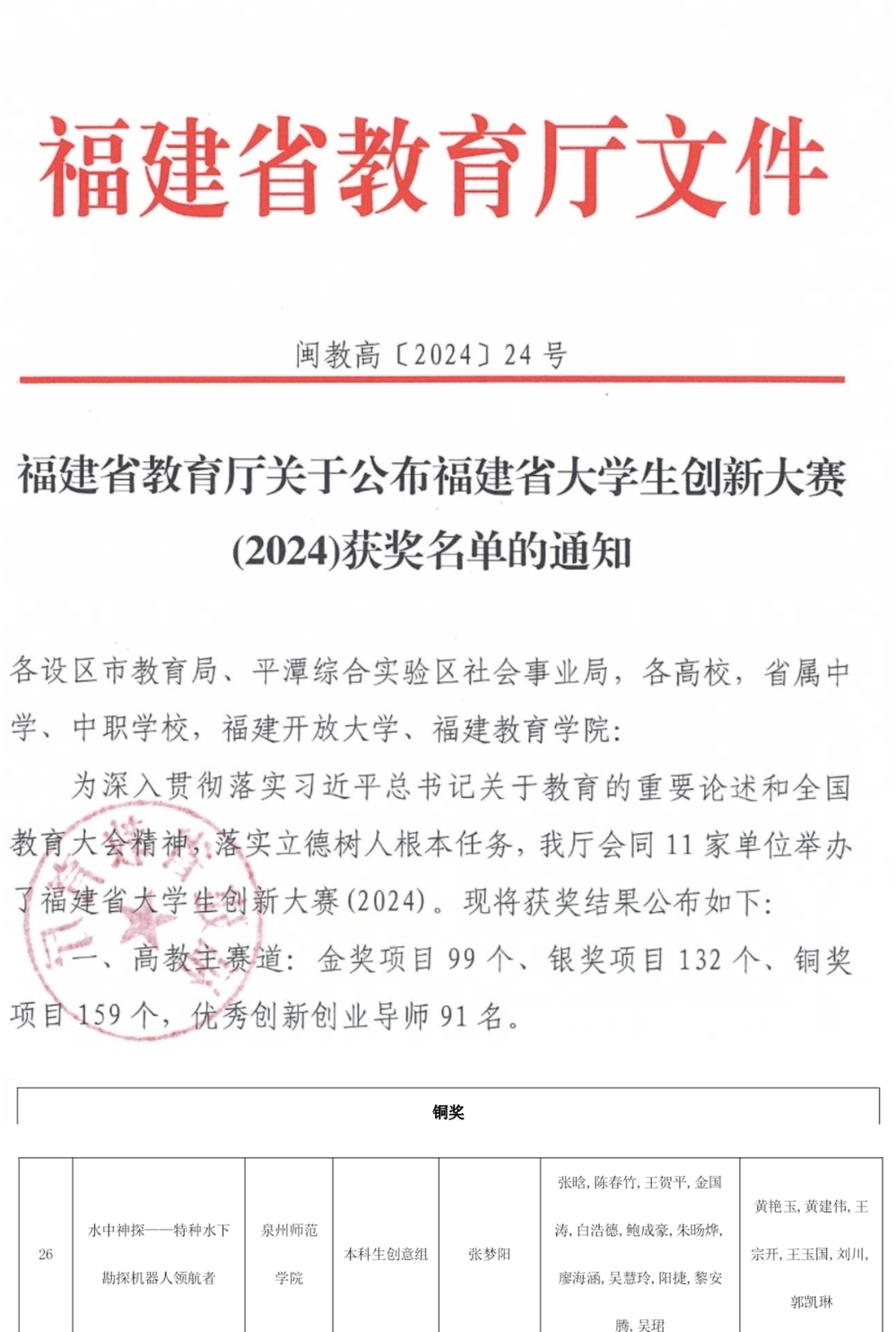 在省教育厅日前公布的福建省大学生创新大赛(2024)获奖名单中,我院学子获得高教主赛道铜奖(指导老师:黄艳玉、黄建伟、王宗开、王玉国、刘川、郭凯琳;成员:张梦阳、张晗、陈春竹、王贺平、金国涛、白浩德、鲍成豪、朱旸烨、廖海涵、吴慧玲、阳捷、黎安腾、吴珺)。