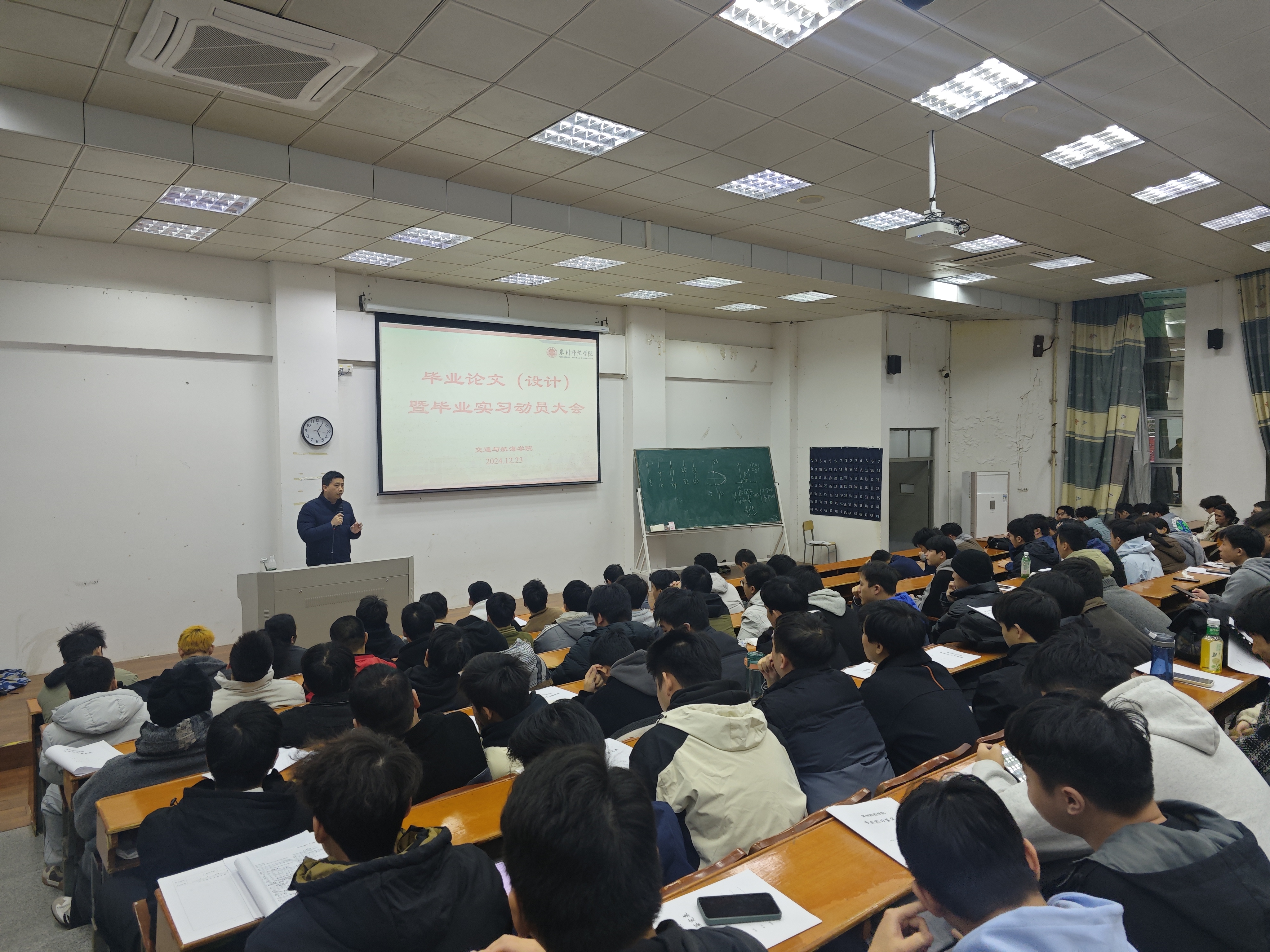 12月23日下午,我院在文A214召开毕业论文(设计)暨毕业实习动员会。院长俞文胜、党委书记张惠典、副院长黄文燕、教学科研办、学工办、全体专任教师及2025届毕业班全体学生参加会议。此次会议旨在明确毕业论文(设计)及毕业实习的工作进度安排,并动员全体师生全力以赴,确保相关工作的顺利进行。