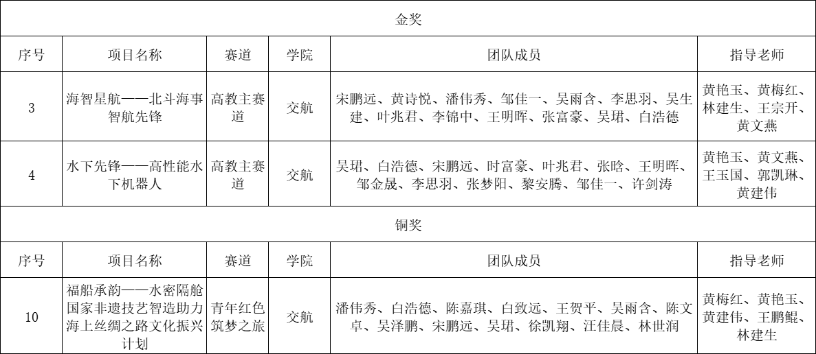 在省教育厅近日公布的福建省大学生创新大赛(2025)获奖名单中,我院学子凭借良好的创新能力与扎实的专业素养,在激烈的竞争中脱颖而出,喜获省级高教主赛道铜奖2项,校级金奖2项、青年红色筑梦之旅赛道校级铜奖1项的好成绩。同时交通与航海学院获得优秀组织奖,黄艳玉老师获得优秀指导教师。