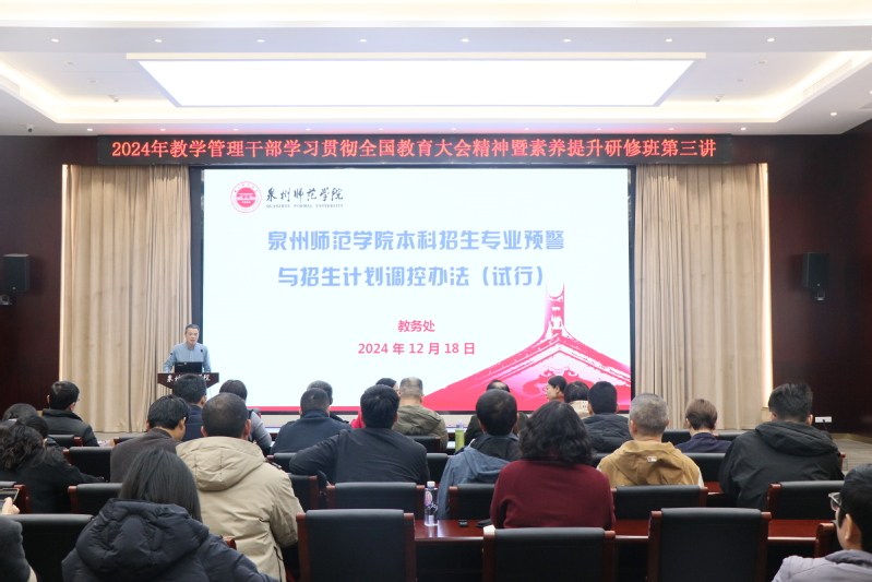 12月18日,2024年教学管理干部学习贯彻全国教育大会精神暨素养提升研修班举办第三讲。副校长陈秋燕出席并讲话,教务处副处长柯佳颖主持活动,二级学院(系)分管教学副院长、教学科研办负责人、教学督导员、专业主任和教研室主任等80余人参加培训。