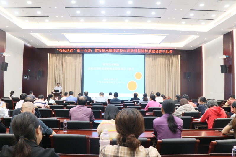 5月29日,学校“杏坛论道”第十五讲在中山纪念堂第一会议室举行。中国西部高等教育评估中心主任、西安交通大学陆根书教授受邀作《数智技术赋能高校内部质量保障体系建设若干思考》主题讲座。副校长陈秋燕出席并为陆根书颁发“杏坛论道”嘉宾证书,各学院(系)教学院长、教学科研办负责人、校级教学督导员、院级教学督导员以及教务处相关人员参加。