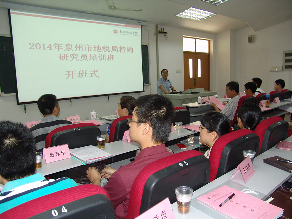 2014年7月22日上午,“泉州市地税局特约研究员”高级研修班开班式在我院荣茂综合楼201教室举行。泉州市地税局副局长颜伟宏,我校继续教育学院陈红波、郑文谦等院领导及干训中心主任出席开班式。开班式由郑文谦主持。