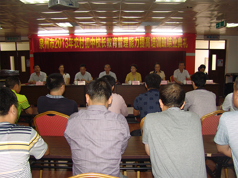 2014年10月10日上午,泉州市2013年义务教育农村初中校长教育管理能力提高培训班结业典礼在泉州师院行政楼二楼会议室举行。泉州市教育局刘殊芳副局长、我校林华东副校长,以及市教育局人事科、继续教育学院相关领导出席结业礼。继续教育学院陈秋燕院长主持典礼。来自泉州市各县市区的67名农村初中校长培训班学员参加典礼。