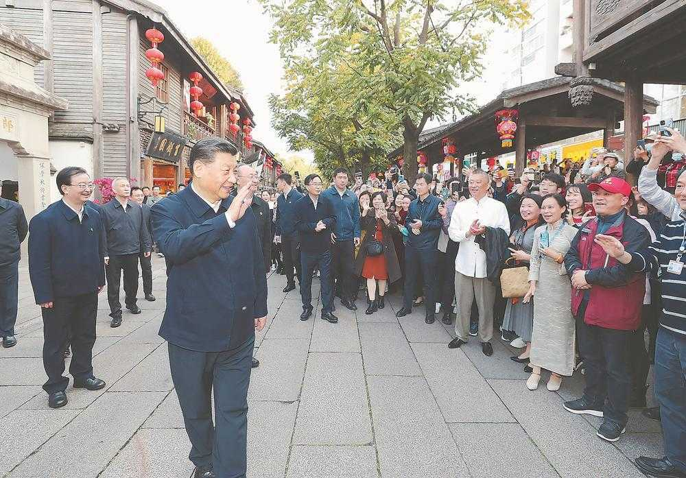 3月24日下午,习近平在福州三坊七巷历史文化街区考察时,向游客和市民招手致意。 新华社记者 鞠鹏 摄