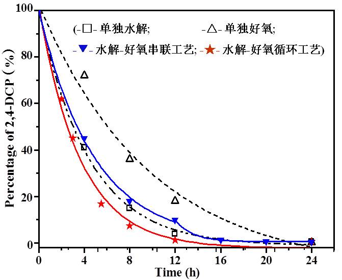 已取得“水解-好氧循环一体化生物处理工艺”处理“对苯二甲酸(PTA)废水”、“2,4-二氯苯酚(2,4-DCP)废水”、“聚乙二醇(PEG)废水”、“活性染料废水”、“淀粉废水”、“餐饮含油废水”小试的各项工艺运行参数、关键技术、优化条件、处理效果及降解特性。该技术已获得国家发明专利的授权“有机废水厌氧-好氧循环一体化生物处理技术,ZL200610135258.8,2006”。