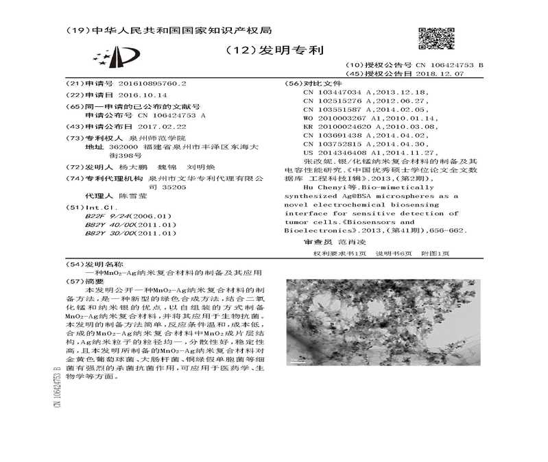 发明专利(专利号:201610895760.2),专利名称:一种MnO2-Ag纳米复合材料的制备及其应用。