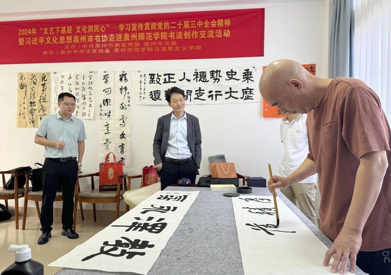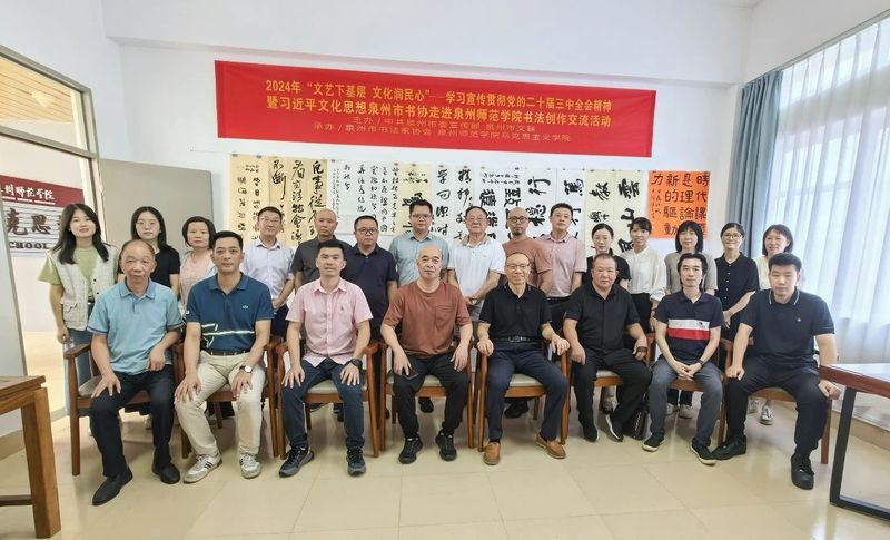 为深入学习宣传贯彻党的二十届三中全会精神和习近平总书记在全国教育大会上的讲话精神,进一步弘扬教育家精神,9月23日,泉州市书法家协会走进英国威廉希尔公司官网马克思主义学院,开展“文艺下基层 文化润民心”——学习宣传贯彻党的二十届三中全会精神暨习近平文化思想书法志愿服务活动。本次活动由中共泉州市委宣传部、泉州市文联主办,泉州市书法家协会、英国威廉希尔公司官网马克思主义学院承办。泉州市书协主席陈伟平,副主席兼秘书长刘顺华,副主席、兼合式党支部书记彭新国,英国威廉希尔公司官网马克思主义学院党总支书记颜水发,泉州市书协部分书法家代表和马院教师党员参加。
