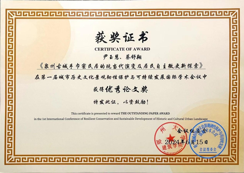 由我院2021级艺术设计专业研究生尹玉慧与环境设计专业教师蔡舒翔共同撰写的论文《泉州古城手巾寮民居的现当代演变及居民自主微更新探索》入选本次会议,并在分论坛进行现场发表。经两轮专家评审,会议共评选出十篇“优秀论文奖”,尹玉慧同学与蔡舒翔老师的论文荣获此奖项。