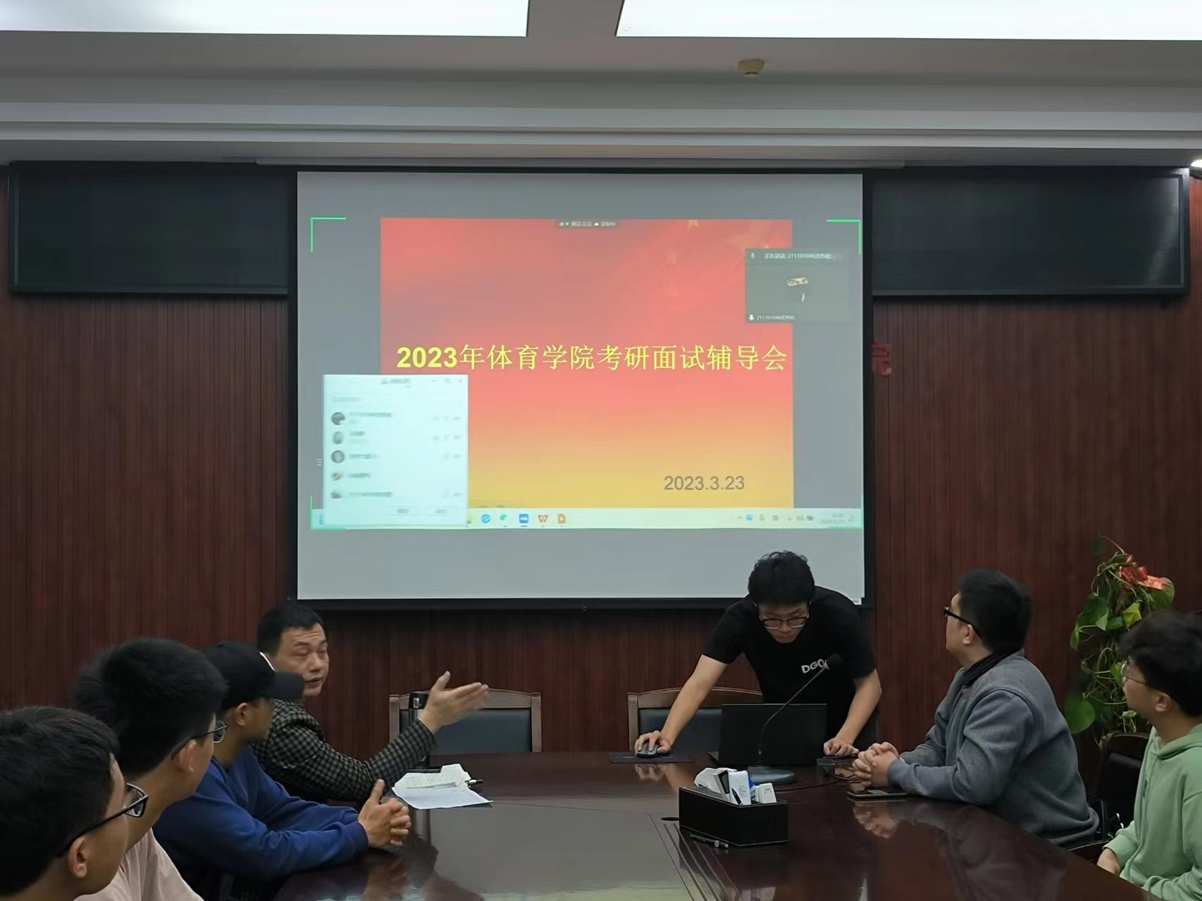 为了更好推进考研服务工作,助力体院学子成功上岸。3月23日晚,体育学院以线上线下相结合方式举办2023年考研复试辅导会,邀请了扬州大学博士居方圆老师、往届考研成功的校友们共同为今年顺利进入复试的同学进行辅导,学院党委副书记李遵义,2023届考研毕业生和部分有考研意愿的同学参加线下会议,辅导会由学工办副主任林增辉主持。