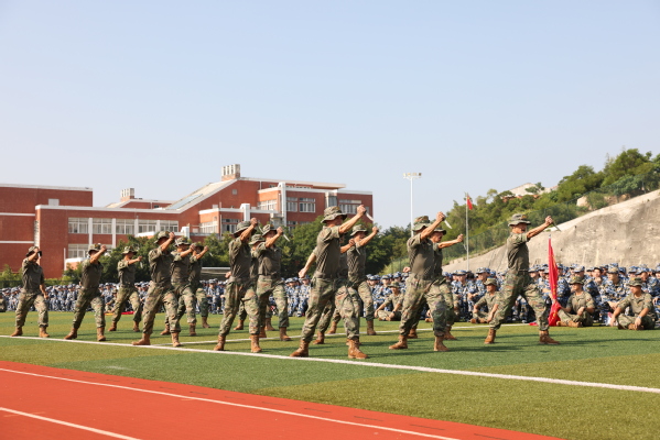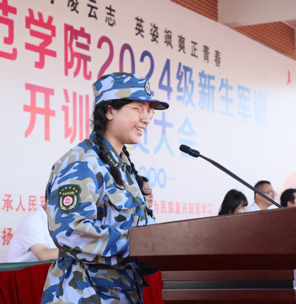 军训团团长江新锋希望参训学生保持坚定的信念和顽强的意志,磨练心智、强健体魄,迈出大学生活坚实的第一步。要求全体教官要用真诚赢得信任,以温暖凝聚人心,引领参训学生挑战自我,接受洗礼。资源与环境科学学院杨淼君代表全体参训新生做了服从命令、听从指挥、吃苦耐劳、超越自我、团结一心、勇闯佳绩的表态。