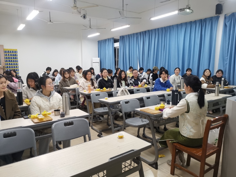 在课堂上,何环珠身着传统茶服,以“闽南茶文化的历史脉络与现代价值”为主题,通过图文并茂的课件和短视频,系统梳理了闽南茶文化的发展历程。她特别提到,安溪铁观音作为福建茶文化的代表,其制作工艺与品鉴技艺被列入国家级非物质文化遗产名录,并现场展示了铁观音的冲泡技法。从“温杯洁具”到“关公巡城”,动作行云流水,诠释了闽南茶道“和、静、怡、真”的精神内核,让大家亲身体验泡茶的过程,感受茶文化的博大精深。